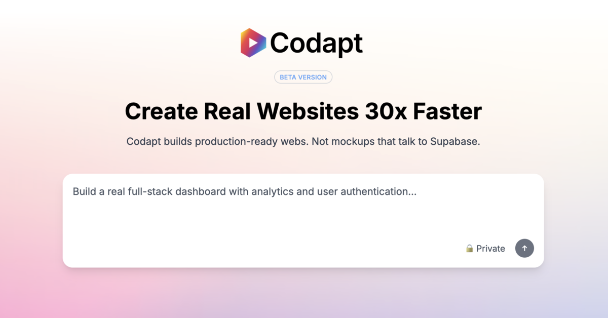 Codapt is an AI platform that generates production-grade, full-stack web application code with integrated backend, frontend, and database, eliminating reliance on external backend services or mockups.