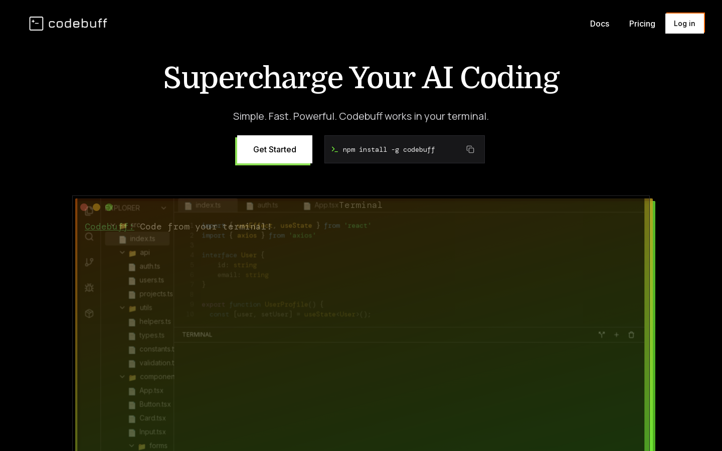 Code faster with AI using Codebuff. Edit your codebase and run terminal commands via natural language instruction.