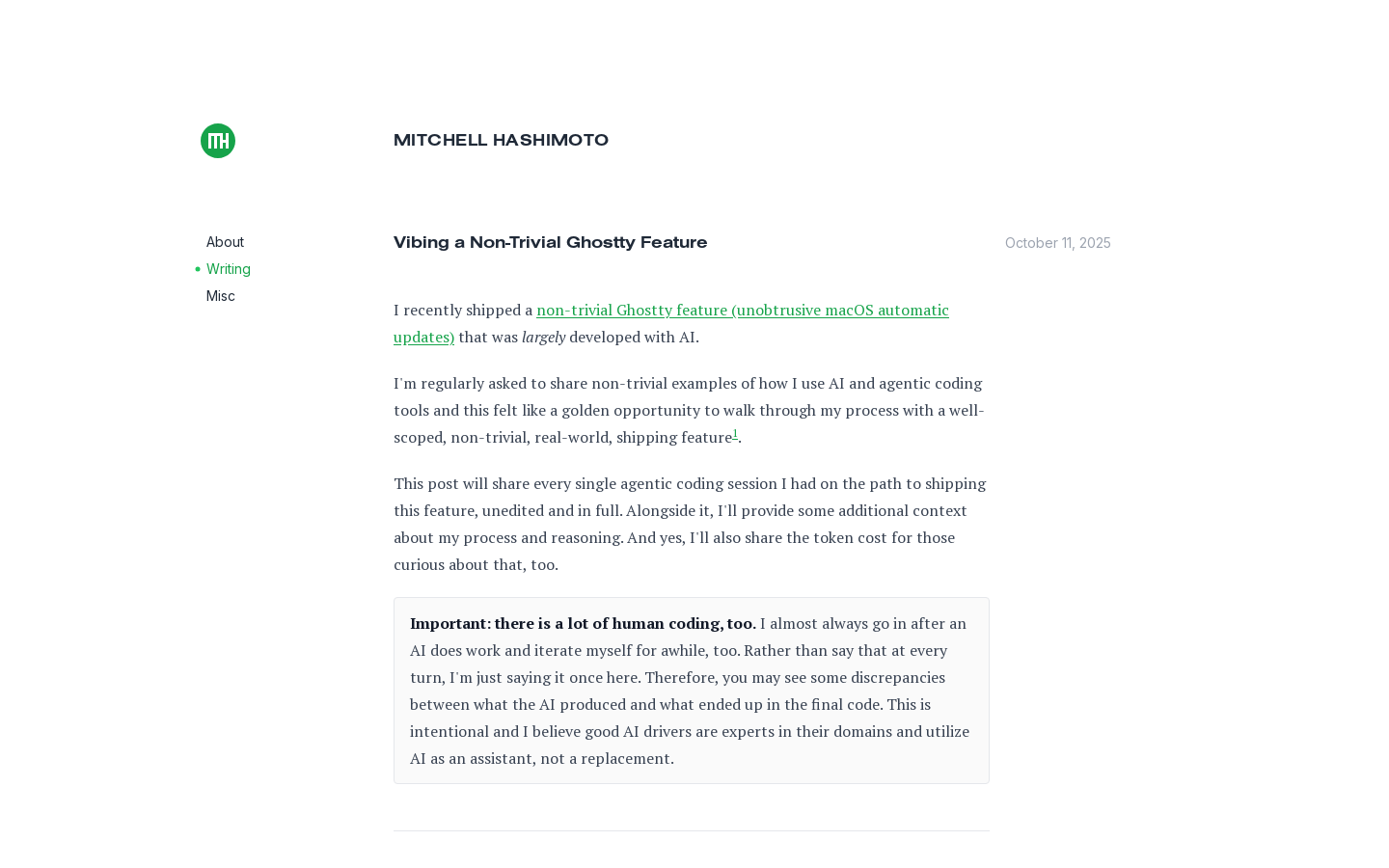 The post documents the development of an unobtrusive macOS automatic update notification feature for Ghostty, created primarily with AI tools but involving substantial human coding and iteration.