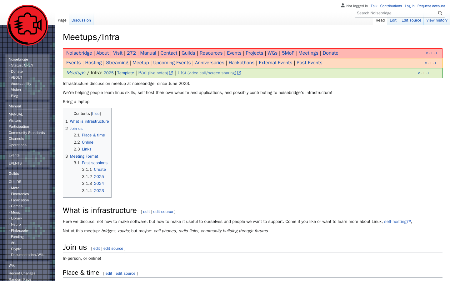 Meetups/Infra at Noisebridge is a weekly infrastructure-focused event held since June 2023, teaching Linux skills and self-hosting of websites and applications.