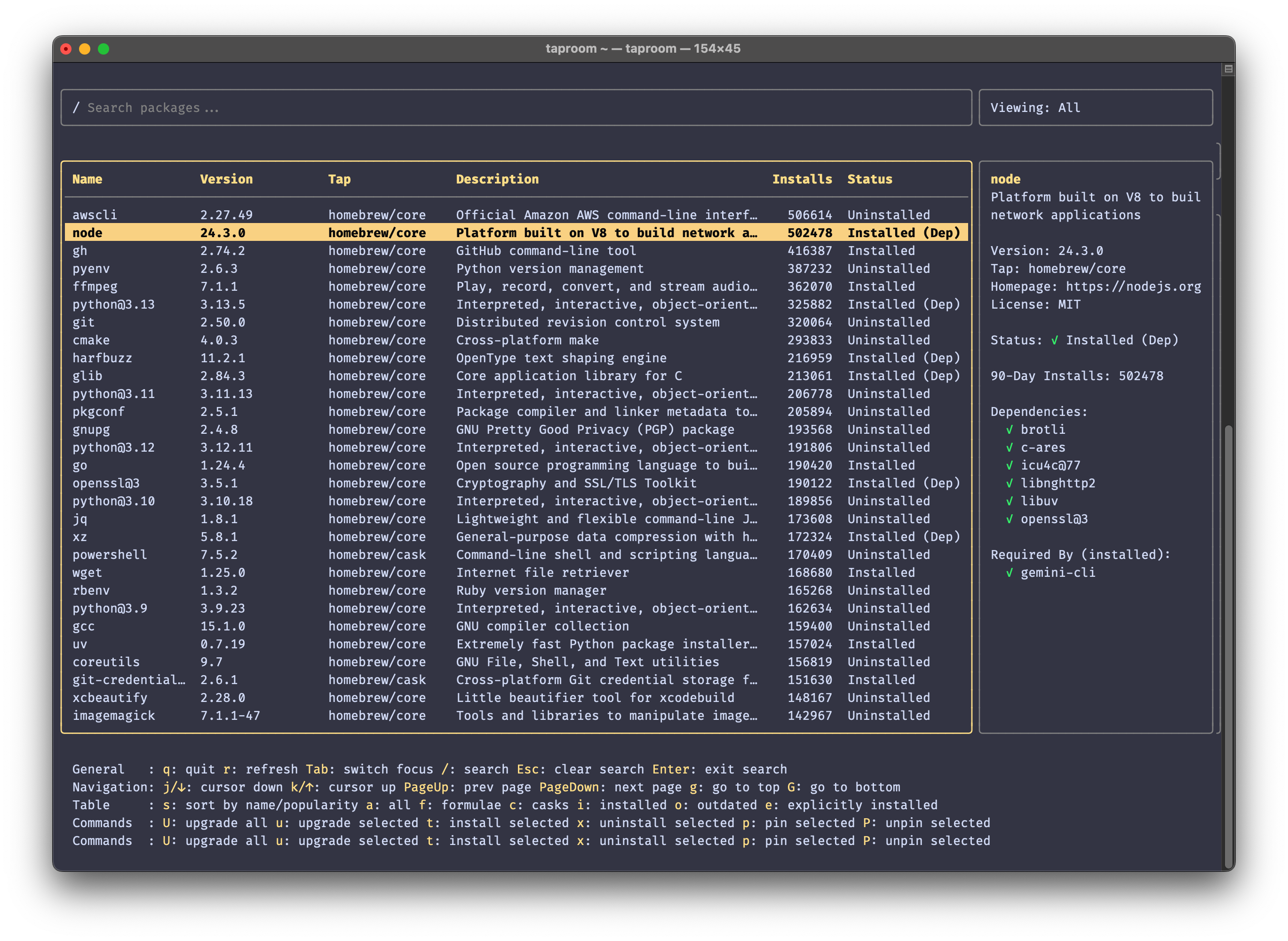 taproom is an interactive terminal user interface for the Homebrew package manager.